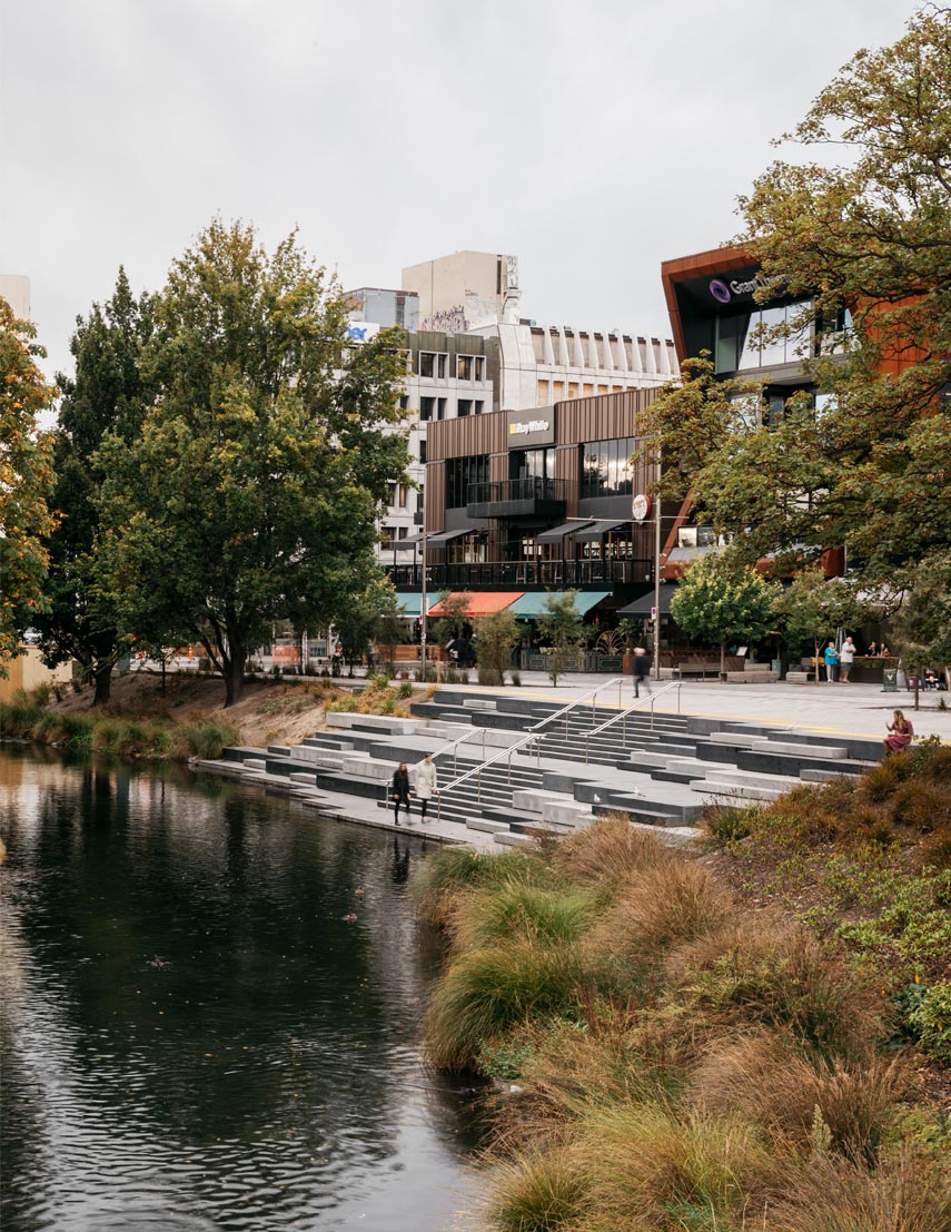 The revitalised Avon River area sets a new benchmark for future public realm projects in the central city. Four themes resonate across the central city that also informed unique design outcomes for the site: