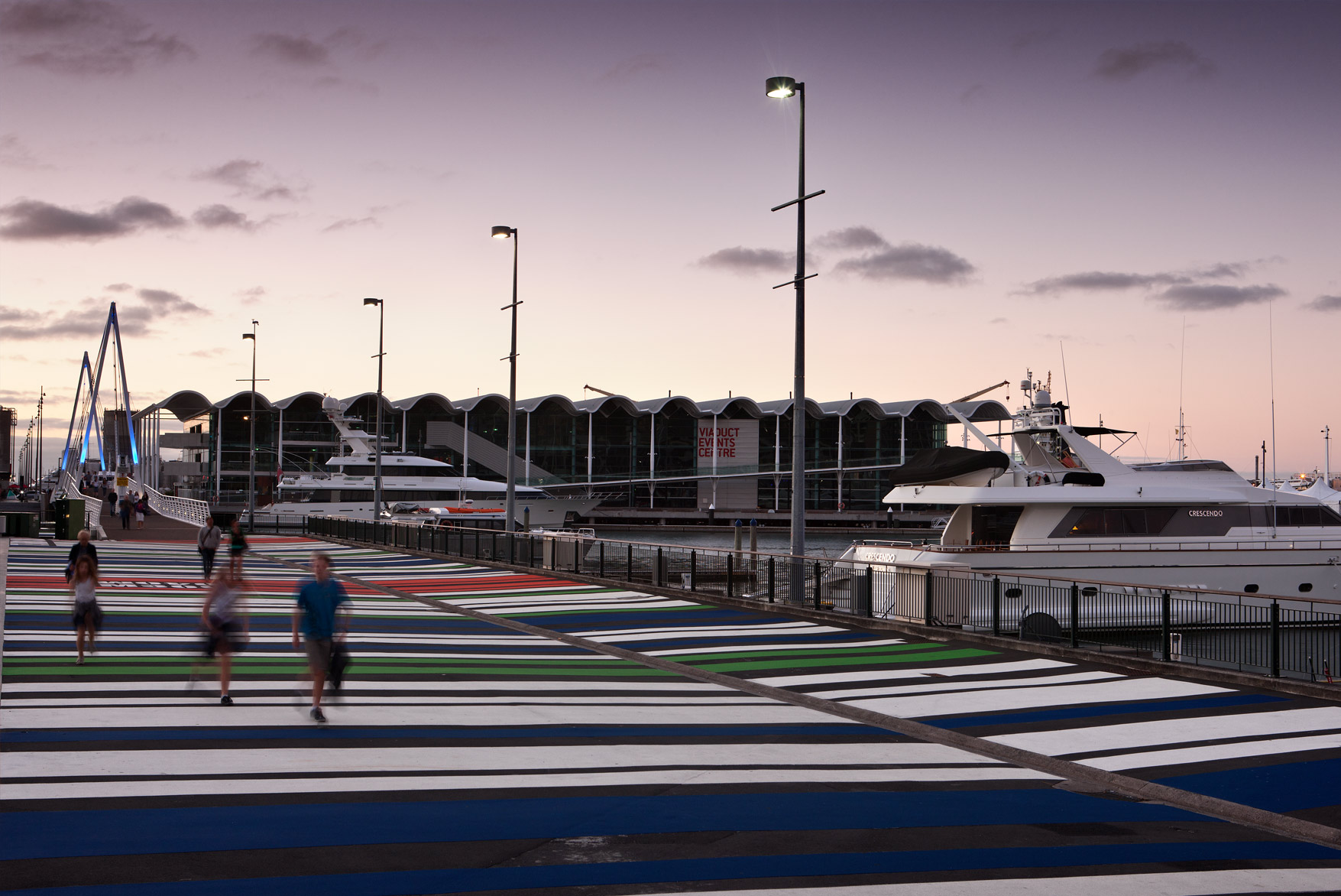 Broad bands of boldly coloured surfacing mark out the new route, which leads from Quay Street through the Eastern Viaduct onto Te Wero Island. From there, the recently completed Wynyard Crossing pedestrian/cycle lifting bridge provides direct access to Karanga Plaza adjoining the newly opened Viaduct Events centre.