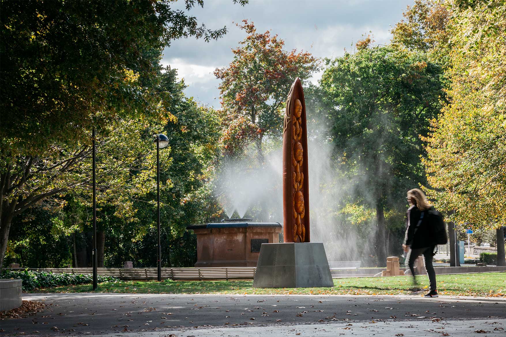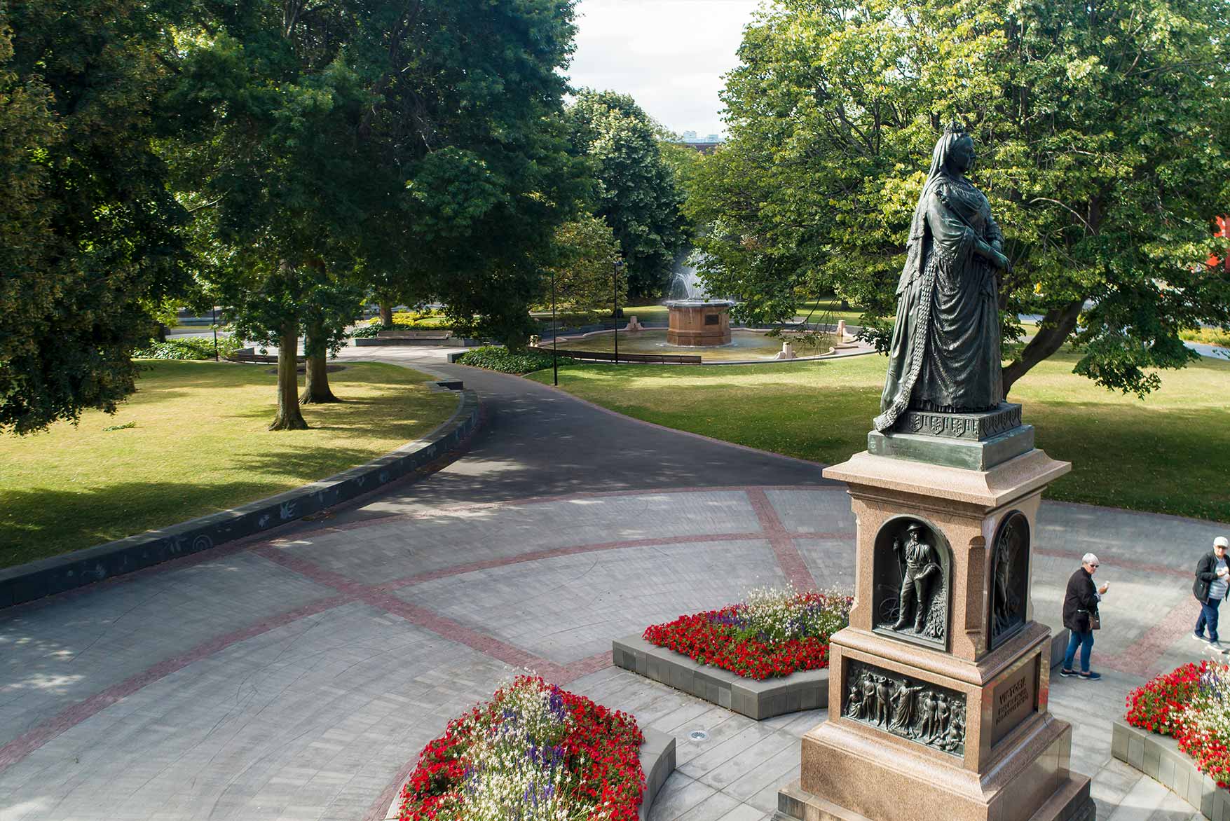 Mana Motuhake (Fayne Robinson, 2019) acknowledges Ngāi Tūāhuriri standing in this place while flanking Queen Victoria in support.