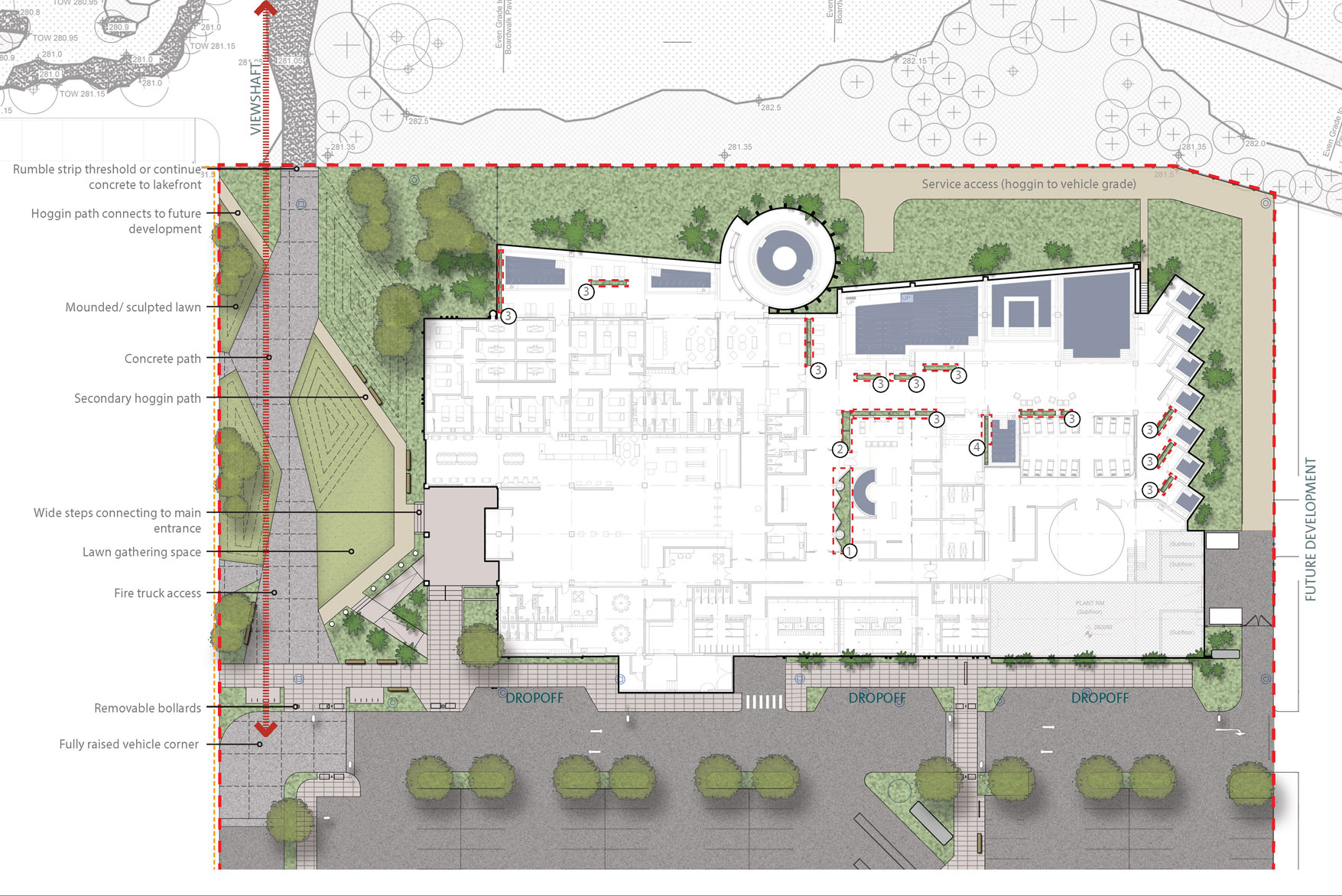 The northern façade of the building faces out towards Lake Rotorua. The foreground is inhabited by a green reserve, including the lakeside walk, canoe launching, mature trees and rich planting. A 1.8m high security fence, designed as a contemporary bespoke element has been designed with inspiration from the traditional Maaori palisade pa fence whilst taking cues of influence from the architectural features of the building. A buffer of native planting is proposed, incorporating a native planted swale for stormwater, increasing biodiversity, providing habitat for local flora and fauna, and continuing the native planted theme used around the building, blending it into the lakefront landscape. Proposed trees buffer views from the lakeside pathway towards the building, whilst still allowing visitors to the Thermal Spa unimpeded views over the Lake.
