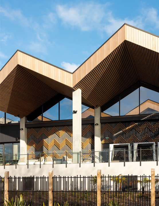 The building nestles into the context of Lake Rotorua and the township by a densely planted buffer at the base of the building. Native and endemic species flourish here which, in turn, enhance local biodiversity. The perimeter planting provides a preview of the planting types and species that are also found within the building, creating a sense of flexibility between indoor and outdoor spaces. Large Ponga trees characterise the perimeter planting areas, specifically the curvature of the built form, echoing their natural habitat of moving through valleys in Rotorua.