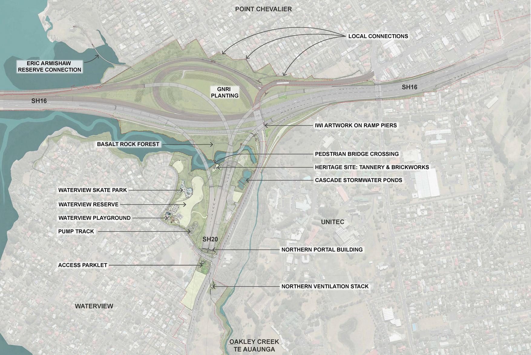 As a result of the severance caused by the above-ground works associated with the project, the Board of Enquiry determined that the large open space areas within the motorway alignment were to be revitalised and new public amenities delivered.