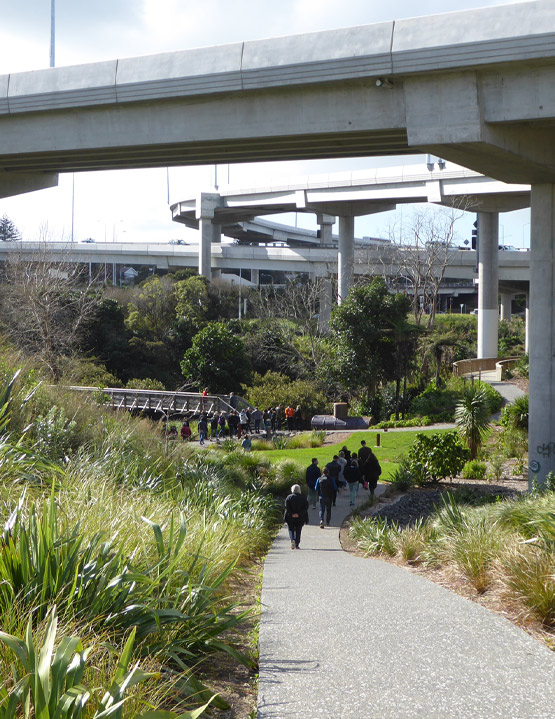 A network of over 10 km of shared paths and footpaths now connects rejuvenated parks and reserves. The Waterview Shared Path, which traces above the underground route of the tunnels, is the final pedestrian and cyclist link between SH20 and SH16 and further enhances the off-road network with side spurs to local roads and neighbourhoods along with artworks, interpretive signage and landscape finishing.