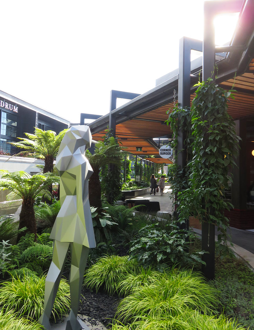 The playspace was designed to appeal to a wide range of age groups, providing a fun, challenging and visually appealing area for children to enjoy whilst their parents shop, chat and relax in the surrounding eateries. The centrepiece is an architectural timber and rope climber, set into an undulating mounded landscape. Tunnels through the mounds entice younger visitors to explore the ground plane, while rock climbing holds provide challenging routes up the mounds and over the tunnels, culminating in a wide slide to zoom back down again.