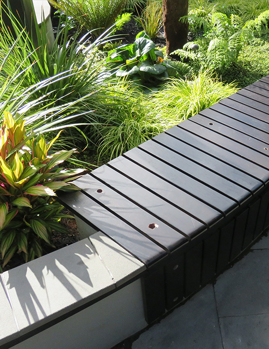 Comfortable timber seating and daybeds set into the surrounding lush planting encourage parents and children to linger and enjoy the whole entertainment precinct.